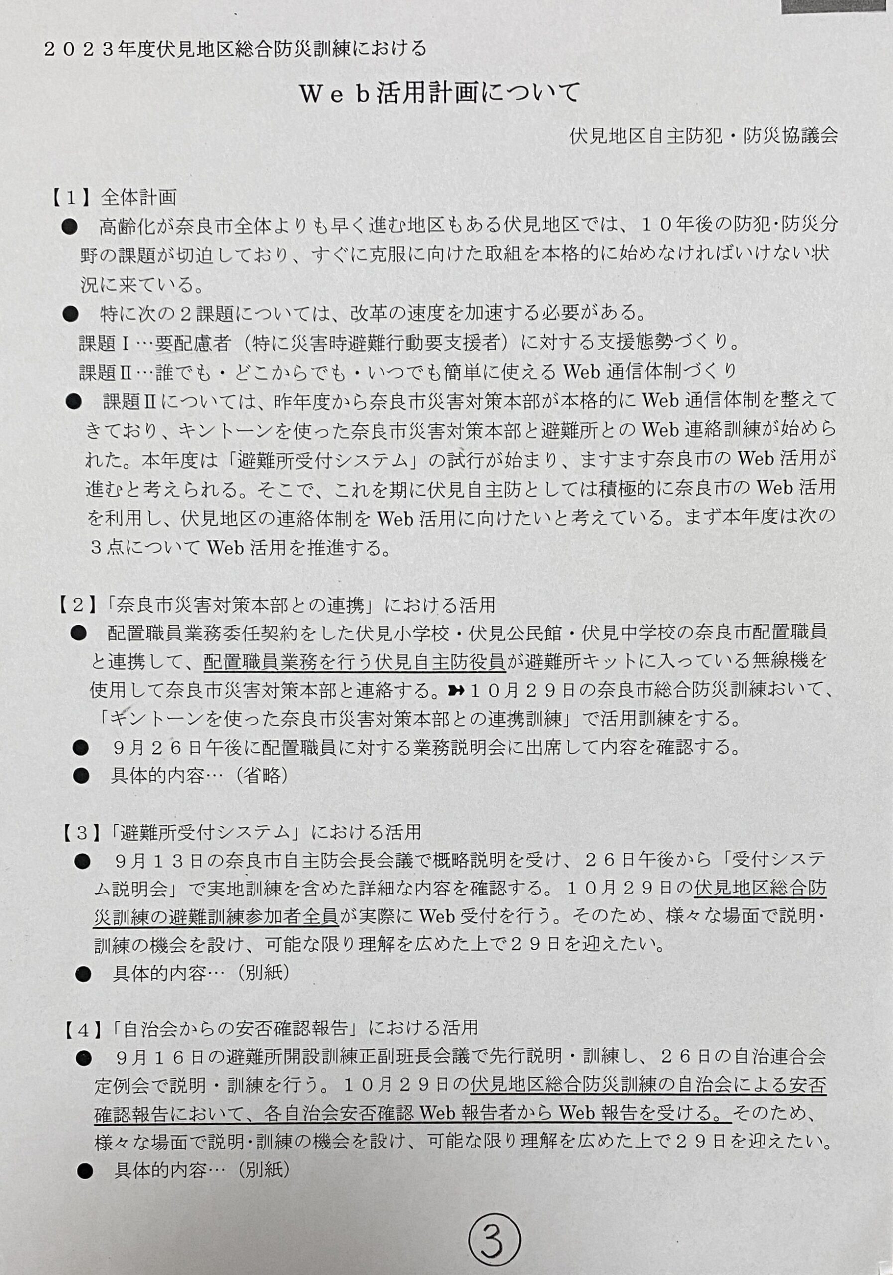 2023年度伏見地区総合防災訓練におけるweb活用計画について 自主防 X Facebook LINE コピー 2023.10.06 2023年度伏見地区総合防災訓練におけるweb活用計画について、以下のような方針が示されました。