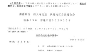 今年度より、振り込みになりました。振込先を確認ください。4月1日付の世帯数です。6月20日締切